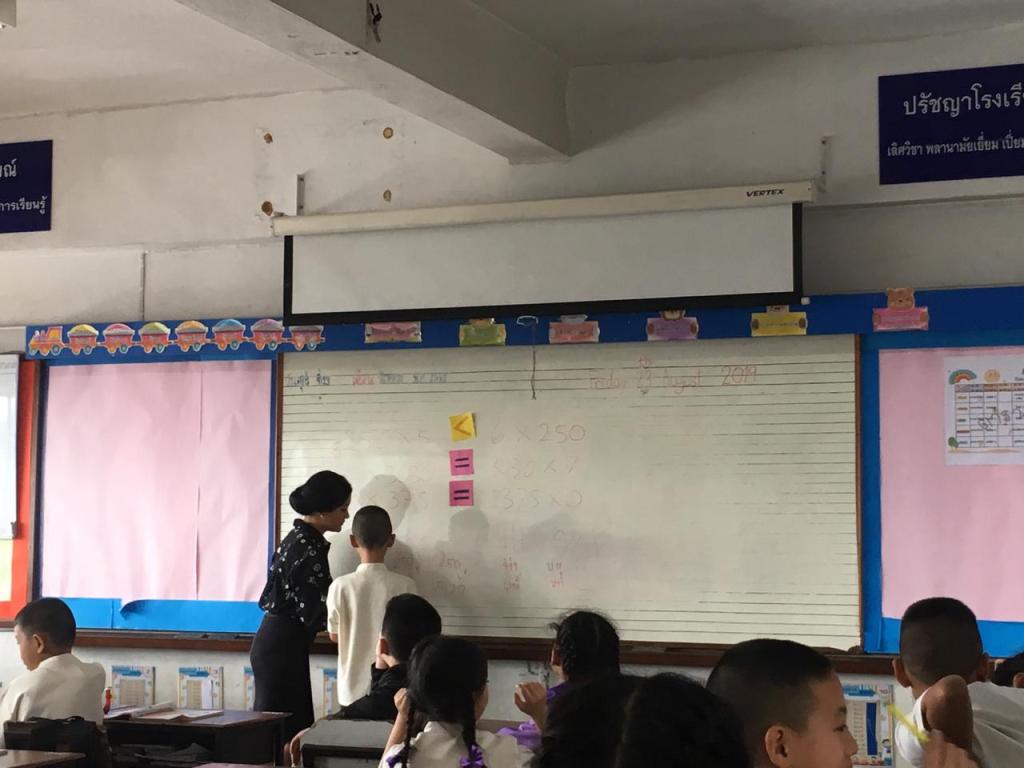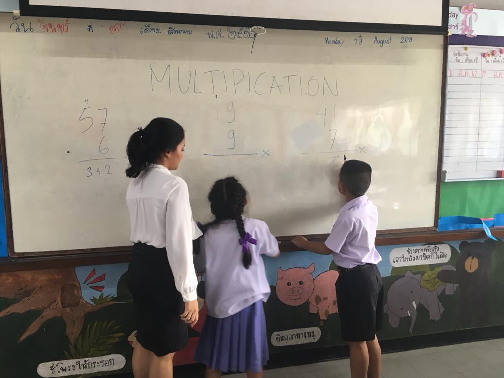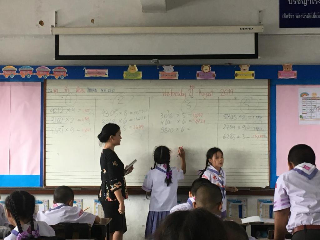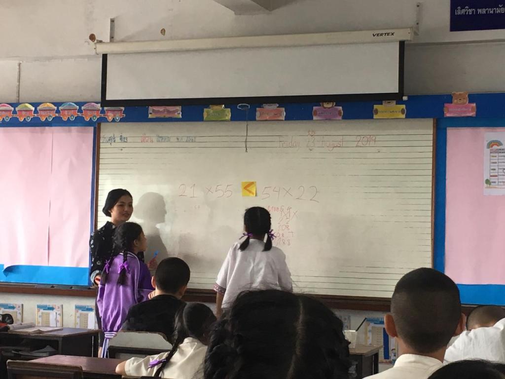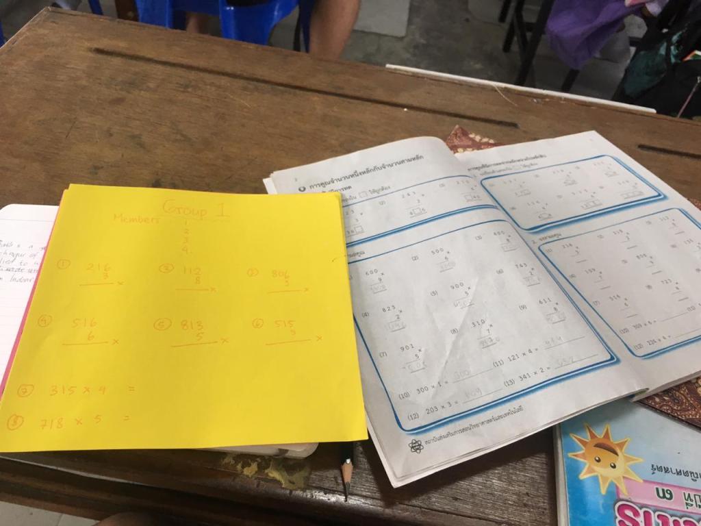 I teach about one digit and four digits multiplication. i divided students to 4 groups per line of the chairs. They do exercise question in the front of the class.
