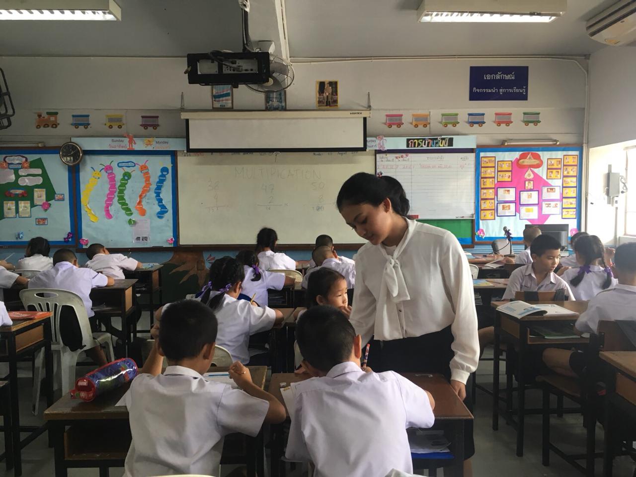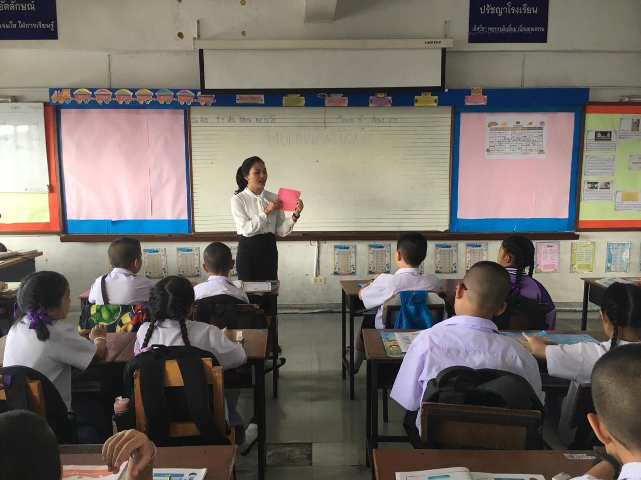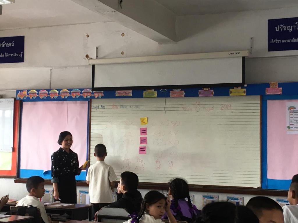 I teach about one digit and four digits multiplication. i divided students to 4 groups per line of the chairs. They do exercise question in the front of the class.