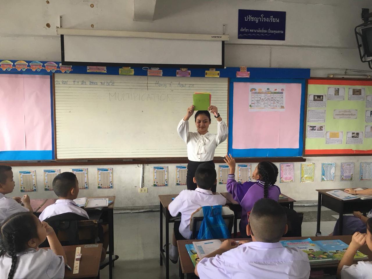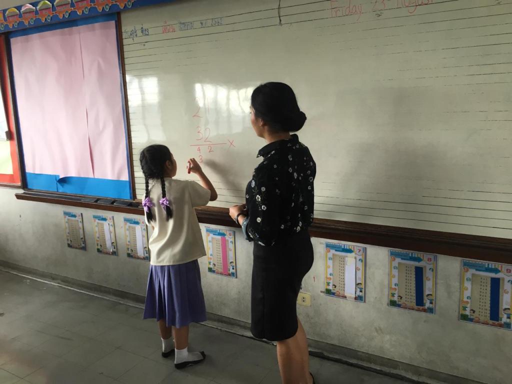 Core activity in this practice is questions and answer about one digit and two digits multiplication. I write some questions in white board and the student raise their hands to answer the questions. Their are very interactive in learning. Student are very exited because i give them star sticker to increase their score.